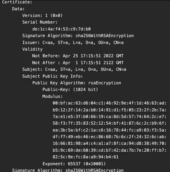 سادهترین روش برای تشخیص اینکه آیا روتر بهدستآمده است یا نه، بررسی گواهینامه خودامضا است؛ میتوانید با پیروی از دستورالعملهای موجود در اینجا این کار را انجام دهید. گواهینامهای که مهاجمان به کار میبرند، دارای تاریخ انقضای 2122 است؛ بازه زمانی طولانی که گواهینامههای معتبر هرگز ندارند. هم صادرکننده و هم صاحب گواهینامه در فهرست، CN=a,OU=a,O=a,L=a,ST=a,C=aa را نشان میدهند.