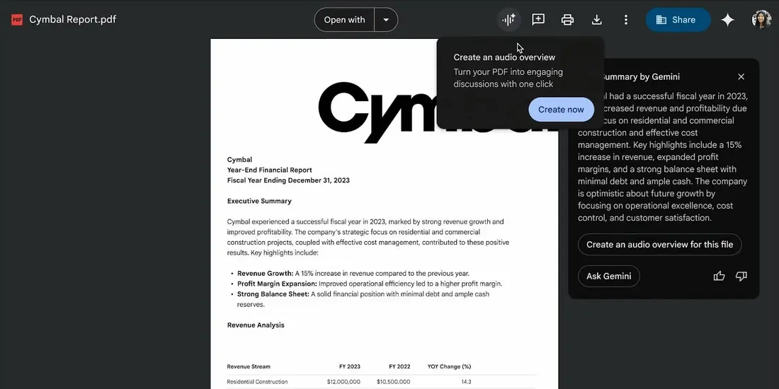بهعنوان افزونهای برای Gemini در نمایشگر PDFهای گوگل درایو، دکمهٔ جدید «مرور صوتی» را در نوار بالایی وبسایت مییابید. با کلیک کردن، پنل کناری Gemini باز میشود و تولید آن چند دقیقه طول میکشد.